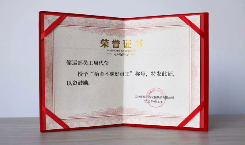 弘揚傳統美德,樹立時代新風,拾金不昧的行為雖然普通,但卻充滿了正能量。讓人們感受到美德的可貴。天津市瑞豐達金屬制品有限公司注重員工精神文明建設,大力弘揚中華傳統文化及美德,學習先進典型,用榜樣的力量深入引導員工將文明道德與職業操守緊密結合,切實的做到內化于心、外表于行。