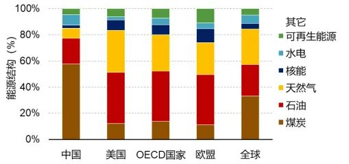 與全球主要經(jīng)濟(jì)體相比,我國重工業(yè)比重偏高,能源結(jié)構(gòu)以煤為主,在新能源利用方面,還有很大的上升空間。