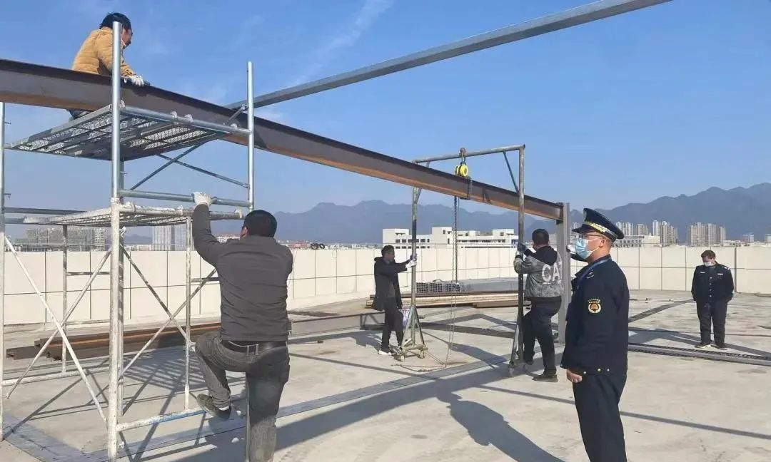? ? ? 原來該企業(yè)正在廠房樓頂建設(shè)光伏系統(tǒng),光伏支架已基本搭建完成,然而,該支架最高端高度近3米,最低端高度也有2.2米,明顯不符合光伏組建設(shè)置標準。執(zhí)法人員當場責令該企業(yè)停止施工,并就“光伏建設(shè)相關(guān)要點指南”進行宣傳講解,指導企業(yè)主規(guī)范設(shè)置光伏系統(tǒng),并督促整改。因其逾期不整改,蘇溪大隊組織人員對光伏支架進行拆除。